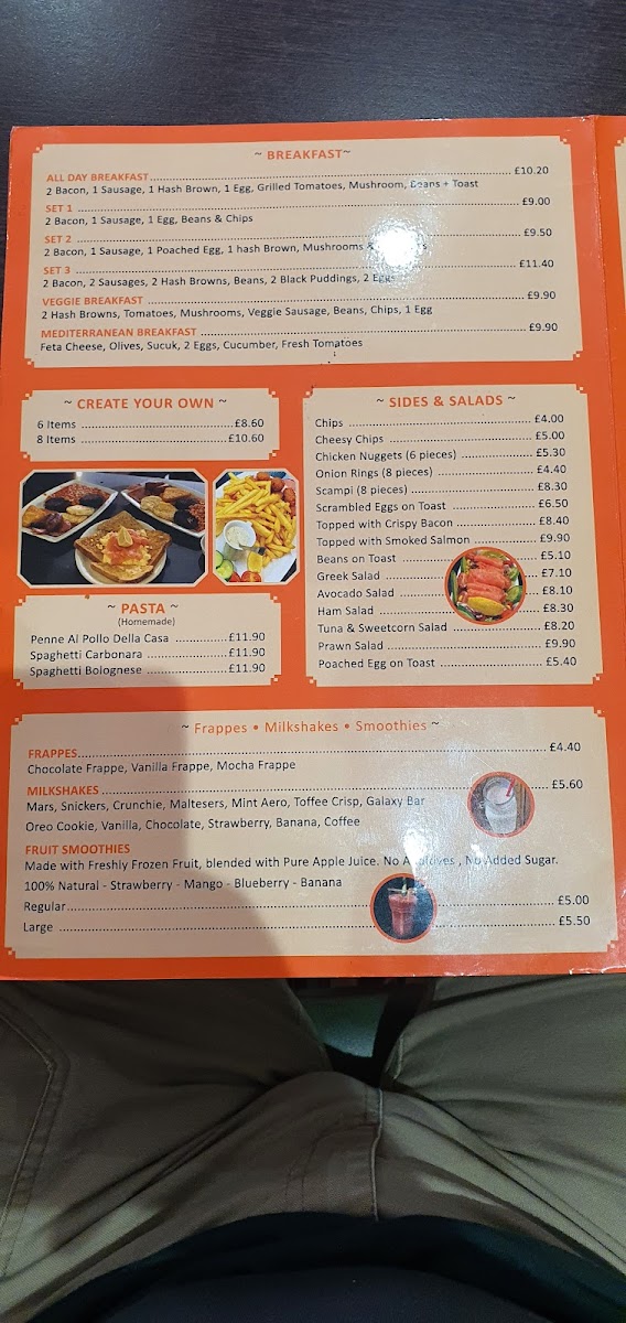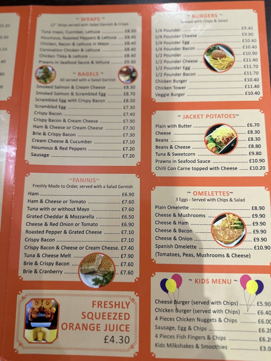 Coffees like the smooth Cappuccino (£3.10) and rich Mocha (£3.60) are complemented by a selection of delicious omelettes, such as the crowd-favorite Spanish Omelette (£10.90). Take a break with their refreshing Hot Chocolate (£3.50) or the delightful Babycinno (£1.90) for the little ones.